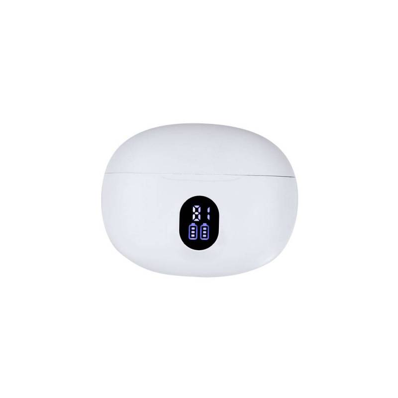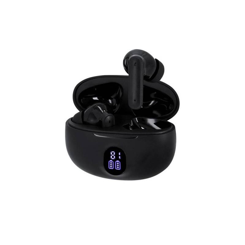 Ver más grande Auriculares intraurales con conexión Bluetooth 5.4, con función manos libres y cancelación de ruidos. De diseño ergonómico, incluyen botón de control táctil integrado en el auricular, con base de carga a juego y pantalla exterior del estado de batería por auricular. Batería integrada de 230 mAh. Manual de instrucciones en español e inglés.