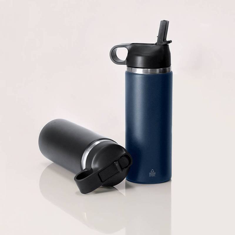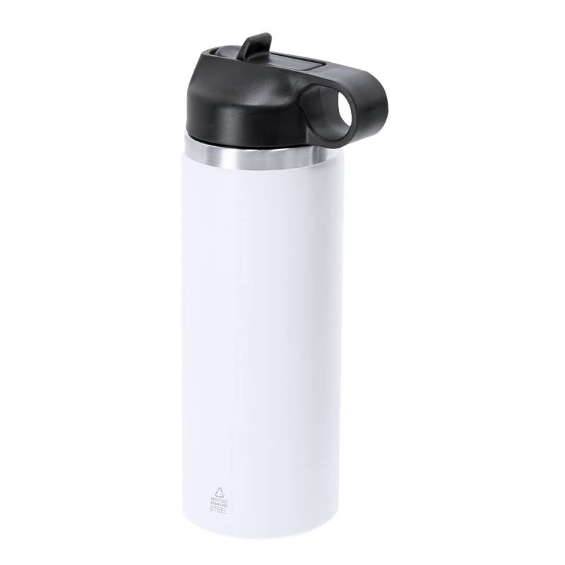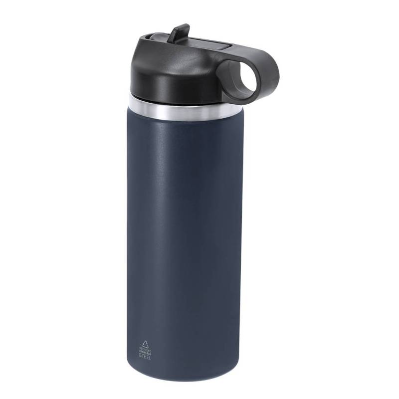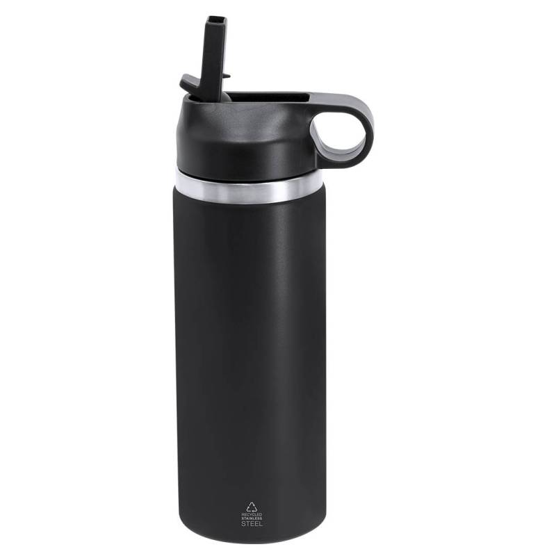 Ver más grande Bidón con 500 ml de capacidad fabricado en Acero Inoxidable Reciclado de doble pared, que garantiza una mejor y más duradera conservación de la temperatura. Sistema de fácil apertura con dosificador de pajita (libre de BPA) y asa de transporte a juego. Con distintivo de Acero Inox Reciclado. El acero es uno de los materiales más demandados y que puede encontrarse casi en todas partes, desde productos de uso diario a grandes construcciones. Con innumerables propiedades, entre las que cabe destacar la durabilidad y su alto grado de reutilización, convirtiéndolo en una alternativa muy valorada en soluciones de sostenibilidad. Debidamente tratado, permite obtener nuevos recursos de infinita utilización.