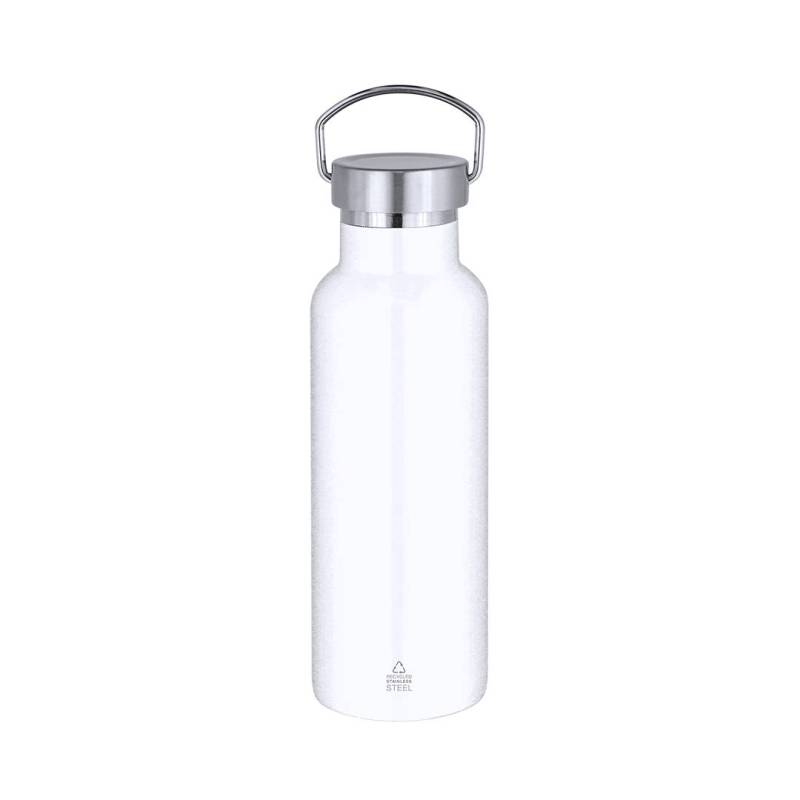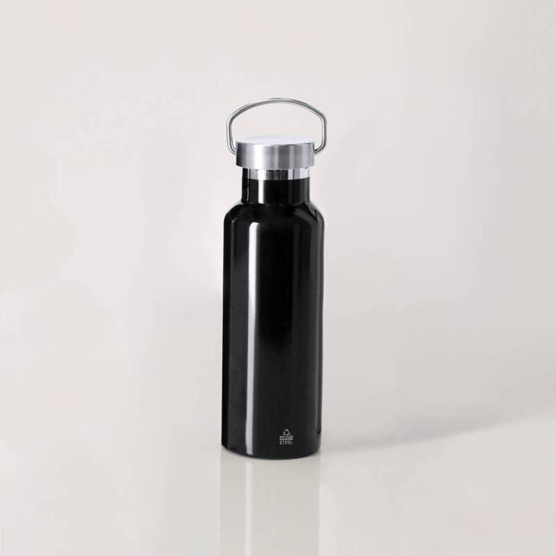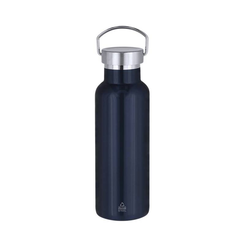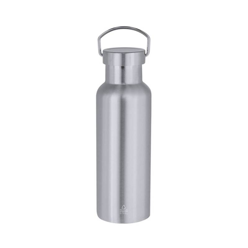 Ver más grande Bidón térmico fabricado en Acero Inoxidable Reciclado de doble pared y 500 ml de capacidad. Acabado en vivos colores con efecto metalizado. Tapón a rosca equipado con asa de trasporte. Incluye distintivo Acero Inoxidable Reciclado. El acero es uno de los materiales más demandados y que puede encontrarse casi en todas partes, desde productos de uso diario a grandes construcciones. Con innumerables propiedades, entre las que cabe destacar la durabilidad y su alto grado de reutilización, convirtiéndolo en una alternativa muy valorada en soluciones de sostenibilidad. Debidamente tratado, permite obtener nuevos recursos de infinita utilización.