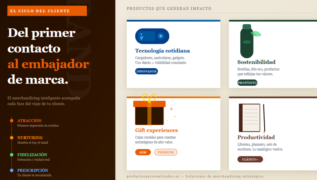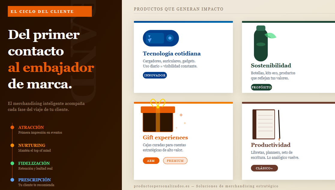 No tiene sentido hacer el mismo pack para un cliente VIP de alto valor que para un asistente de feria. Define los segmentos de receptor y construye un pack para cada uno. Productospersonalizados.es permite tiradas flexibles que facilitan esta segmentación.