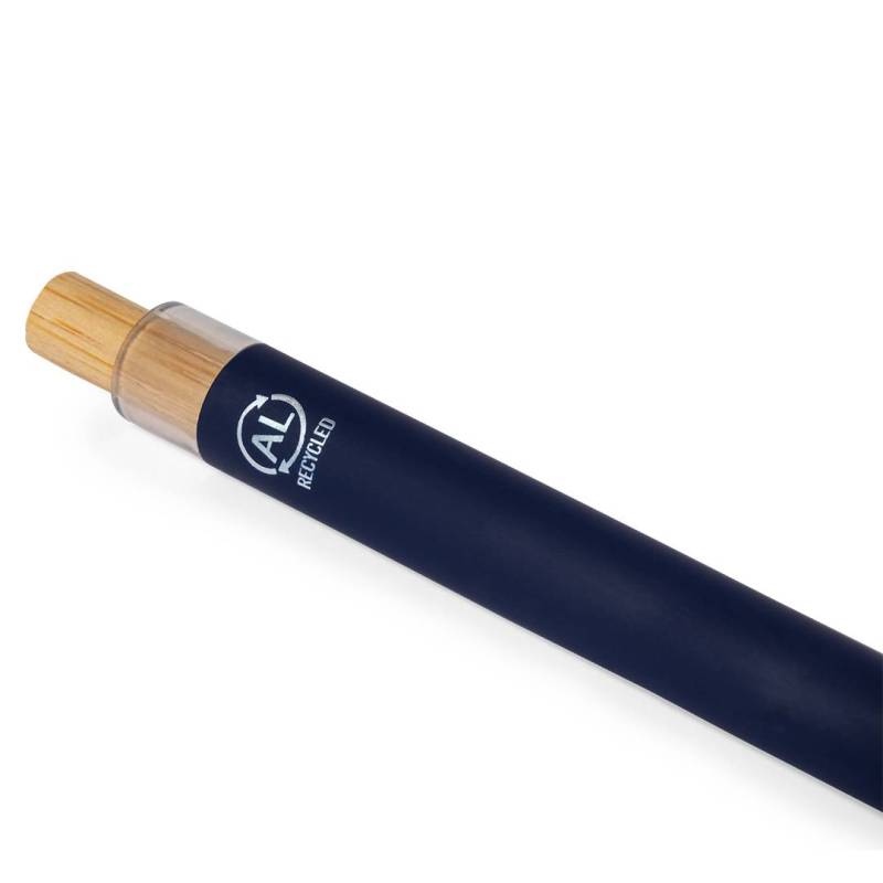 Ver más grande Bolígrafo de mecanismo pulsador fabricado en aluminio reciclado. Pulsador en bambú y cuerpo acabado goma, disponible en variada gama de elegantes colores. Clip metálico y distintivo aluminio reciclado en la parte superior del bolígrafo. De cartucho jumbo y en tinta azul. Presentado en bolsa individual reciclada. El aluminio reciclado es un material con posibilidades de reciclaje casi infinitas, sin perder sus propiedades originales y consumiendo menos energía en este proceso. Certificación GRS (Global Recycled Standard / Estándar de Reciclaje Global), que garantiza el origen reciclado del material usado para fabricar el producto.
