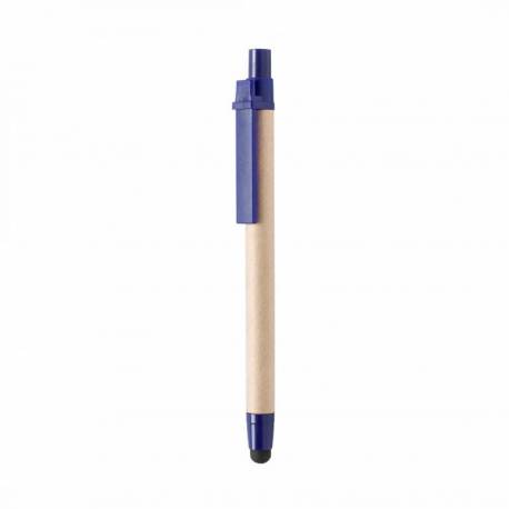 Ver más grande Bolígrafo puntero de mecanismo pulsador en original combinación de cuerpo en cartón reciclado de color natural y accesorios en vivos colores con puntero negro. Tinta azul.