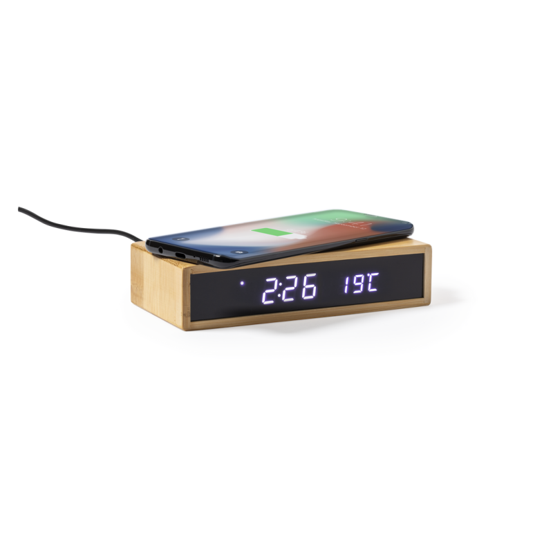 Ver más grande Reloj de mesa multifunción de línea nature, con cargador inalámbrico 5W integrado. Fabricado en bambú procedente de cortes naturales. Función fecha y hora, alarma y termómetro. Alimentación mediante conexión USB, con cable micro USB y adaptador de pared incluido. Pila de botón incluida que permite guardar los datos en caso de desconexión. Compatible con dispositivos equipados con tecnología de carga inalámbrica y presentado en atractiva caja de diseño. Disponible manual de instrucciones en español e inglés.