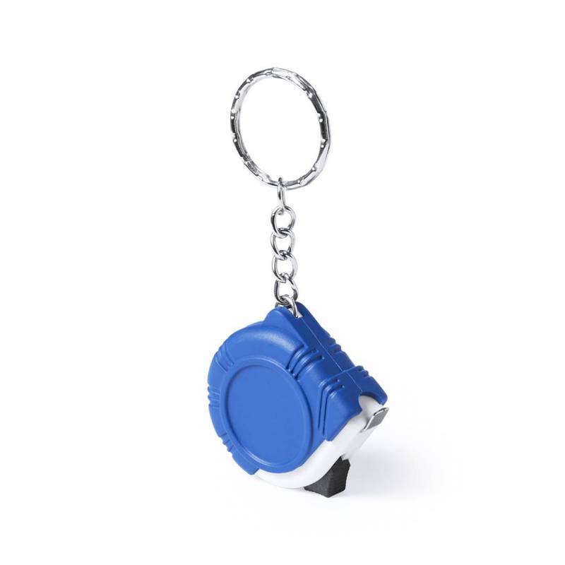 Flexómetro llavero de 1 metro con cuchilla metálica y mecanismo de bloqueo. Medidas en centímetros, pulgadas y pies. Con troquelado especial para marcaje. Llavero flexómetro