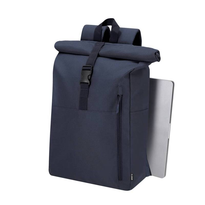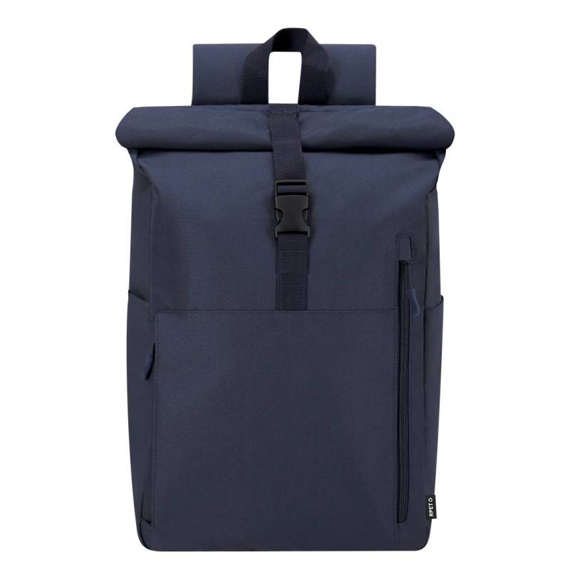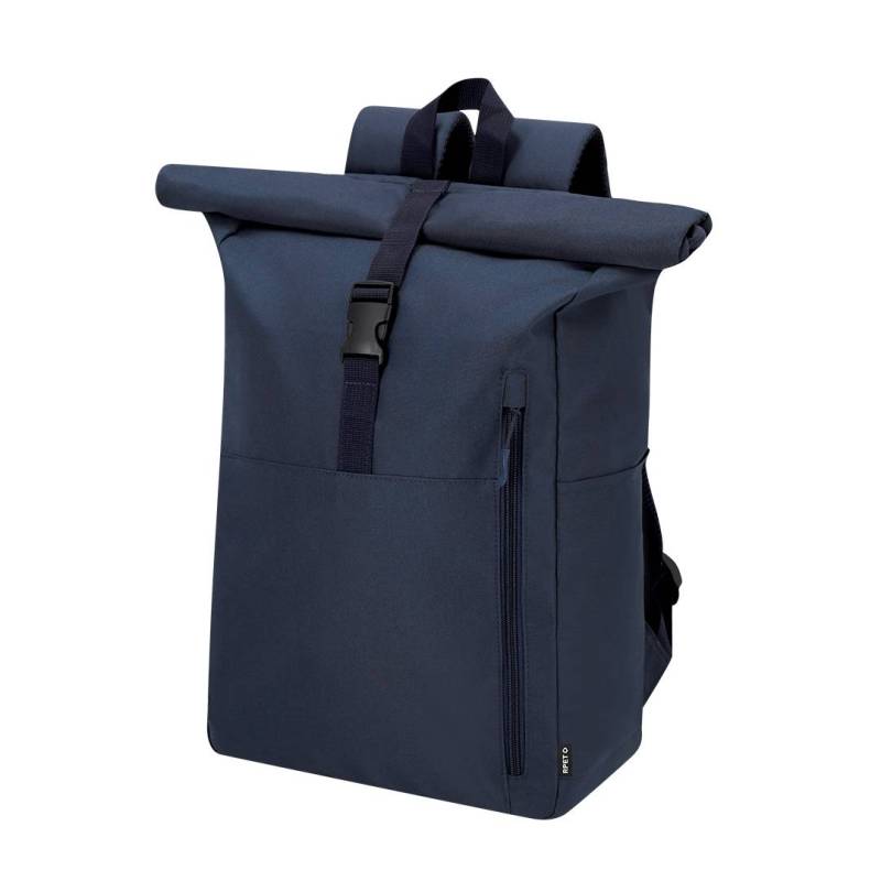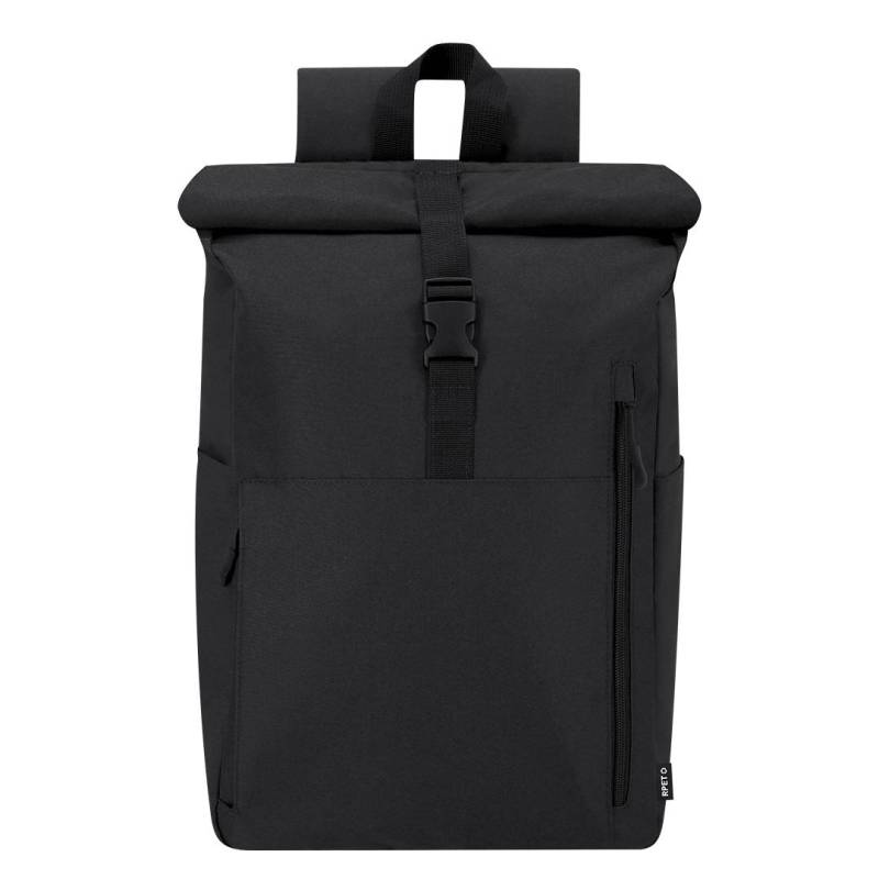 Ver más grande Mochila confeccionada en resistente RPET 300D. Con sistema de cierre enrollable y hebilla. Dispone de dos bolsillos frontales, un bolsillo trasero con acceso lateral y dos bolsillos laterales adicionales. Interior de gran capacidad con compartimento interior acolchado para portátil de hasta 15 pulgadas. Cintas de hombros y espalda acolchachadas. Incluye cinta de transporte para ajuste en trolley o maleta, ideal para viajes y desplazamientos. El material RPET se elabora a partir de plástico reciclado, para así fomentar la reutilización de residuos plásticos y ayudar a la sostenibilidad del planeta.