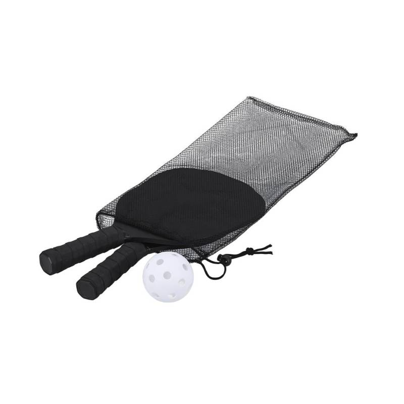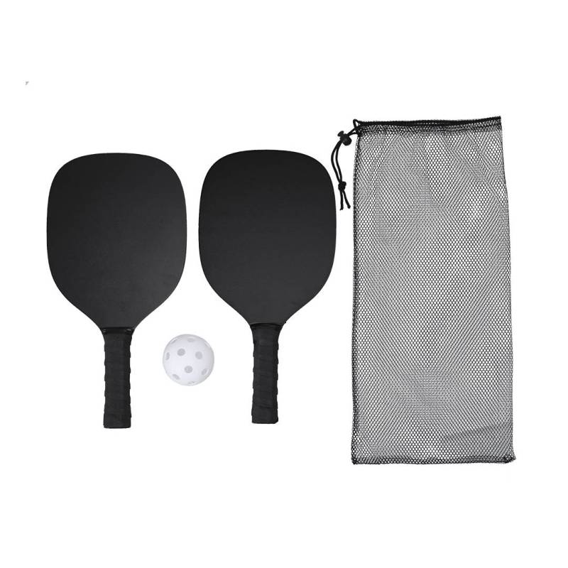 Ver más grande Par de palas de Pickle Ball de madera MDF en acabado mate con pelota. Mango recubierto en suave EVA en color negro para mejor agarre. Incluye bolsa de malla RPET para guardar y fácil de transportar.