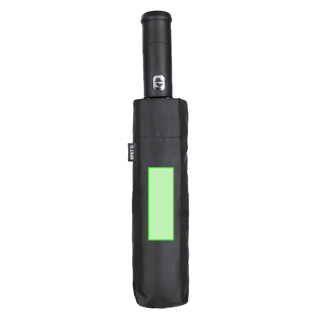 Ver más grande Paraguas fabricado en RPET. Incluye práctico mango linterna con giro de 180º en suave tacto goma y botón ON/OFF. Diámetro de 105 cm en material pongee 190T RPET. De apertura y cierre automáticos, con sistema antiviento y varillas en fibra de vidrio. Incluye distintivo RPET en funda. Alimentación a pilas (de botón incluidas).El material RPET se elabora a partir de plástico reciclado, para así fomentar la reutilización de residuos plásticos y ayudar a la sostenibilidad del planeta.