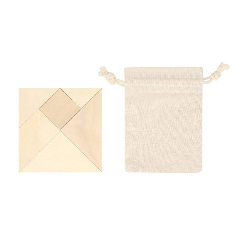 Ver más grande Puzzle con piezas de madera para despertar el ingenio y habilidad de los más pequeños. En bolsita de algodón con cuerdas ajustables para cierre.
