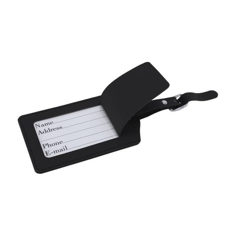 Ver más grande Set de viaje compuesto por funda para pasaporte y etiqueta de equipaje, fabricados en suave PU . Funda equipada con compartimento especial para pasaporte, además de compartimento para tarjeta. Etiqueta ajustable correa con hebilla plateada que incluye etiqueta con campos de datos rellenables. Presentado en funda negra.