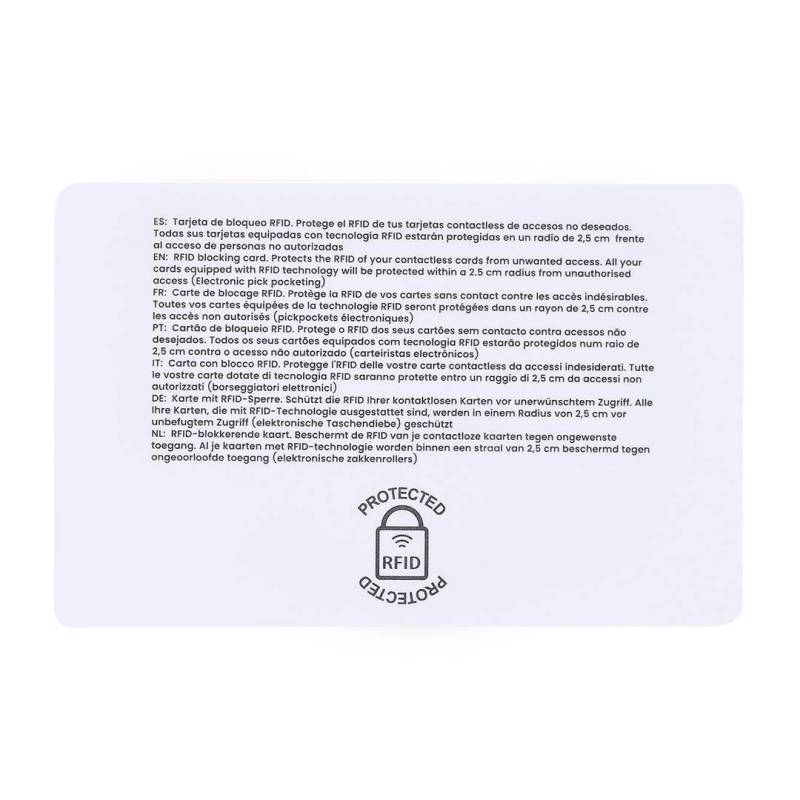 Ver más grande Tarjeta con sistema de protección RFID, diseñada para bloquear accesos no autorizados a tarjetas contactless. Funciona mediante un campo electromagnético que interfiere con las señales de lectura, protegiendo las tarjetas ( bancarias, de crédito, transporte público, etc.) ubicadas en un radio de entre 2 y 3 cm alrededor de la tarjeta.