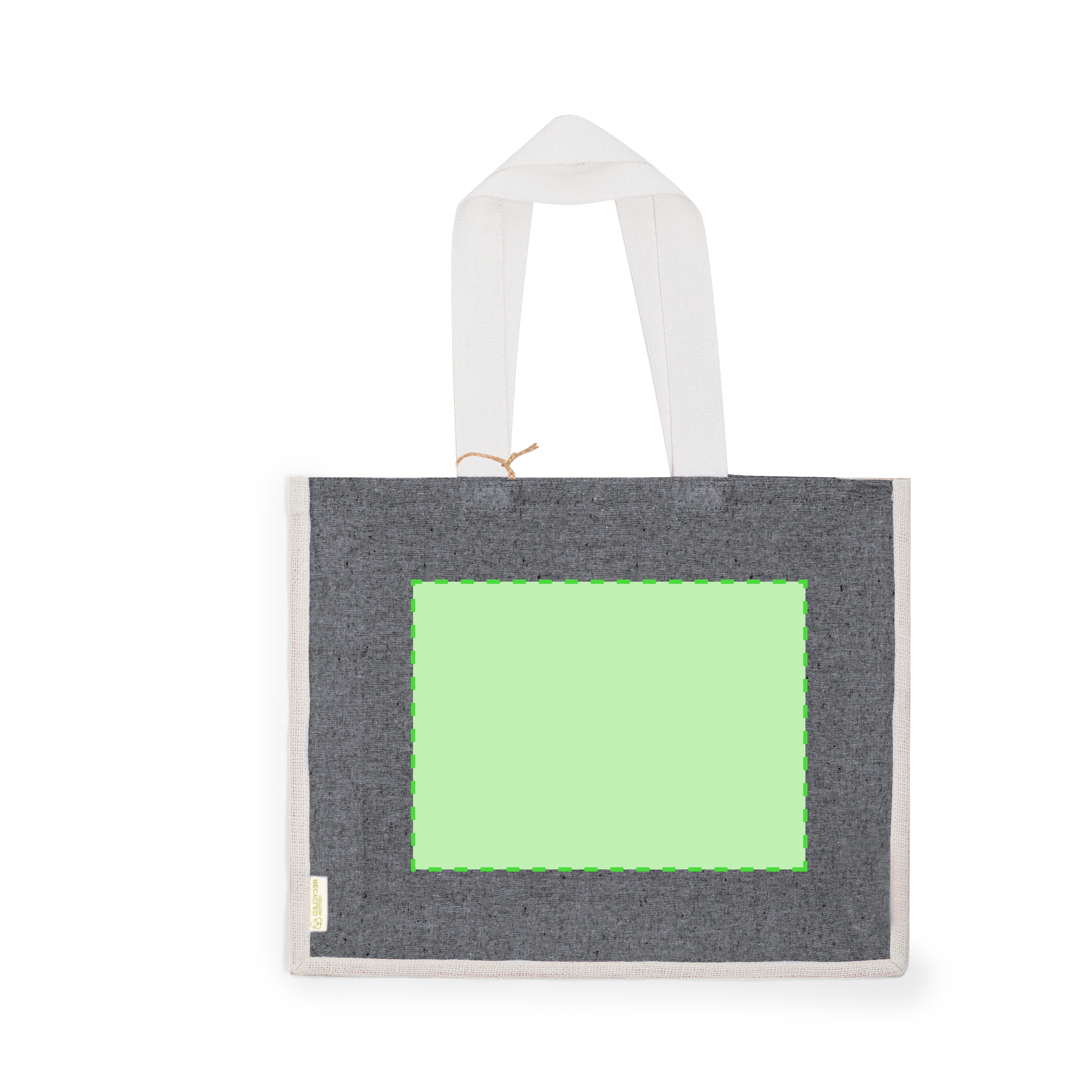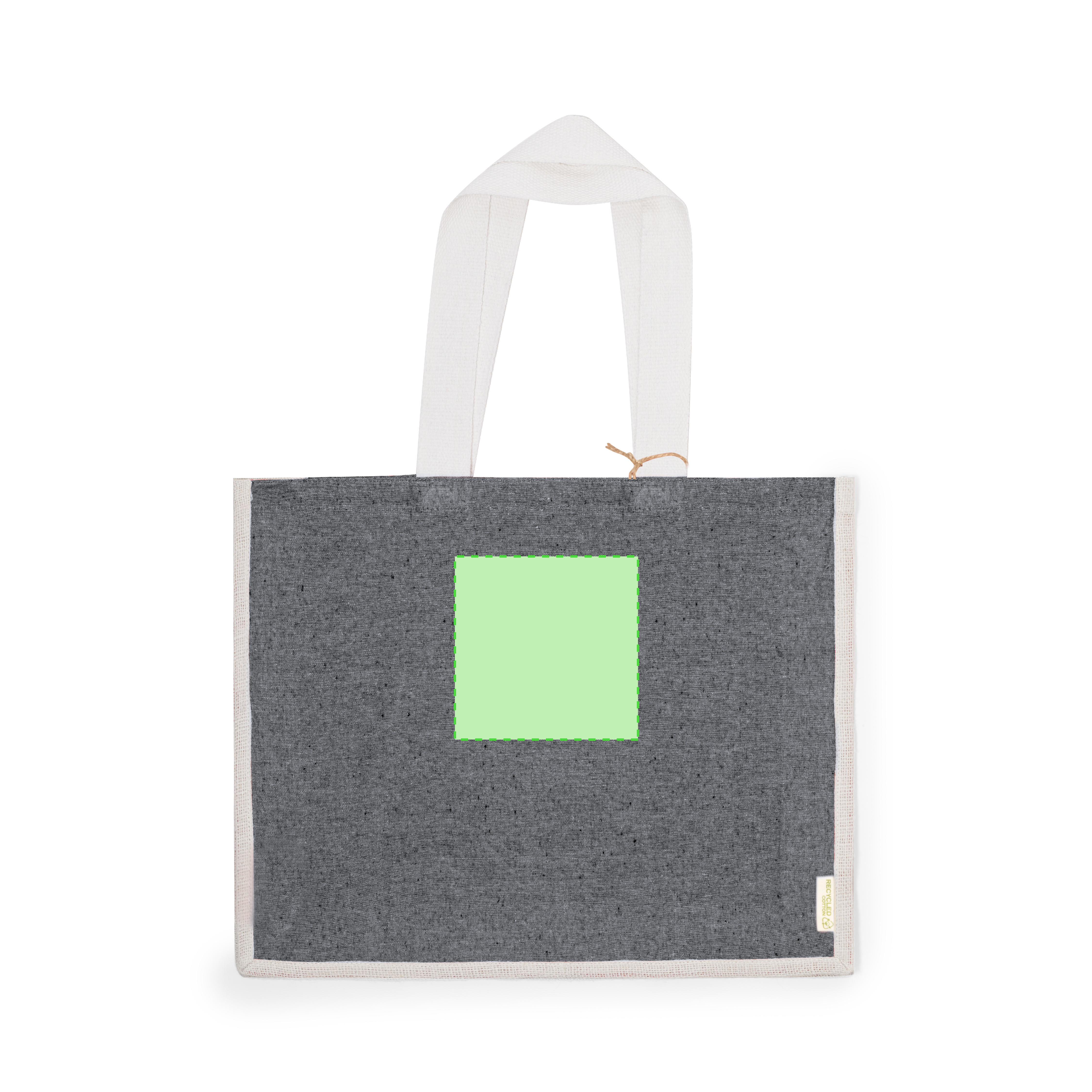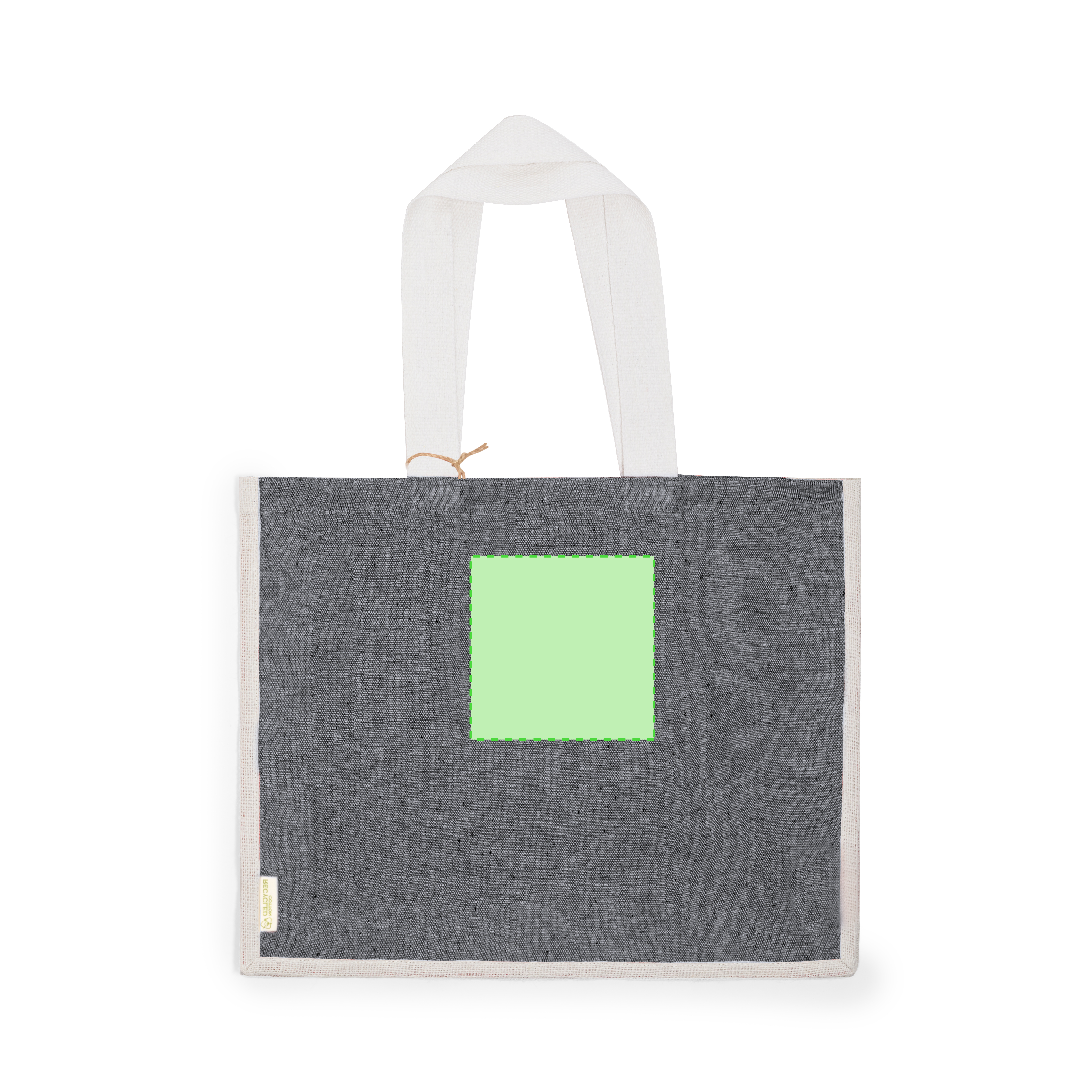Ver más grande Bolsa en material 100% algodón reciclado de 140 g/m2 en combinación con el yute. Asas largas de 70cm con refuerzo, de acabado cosido y fuelle de yute. Logotipo en etiqueta lateral y resistencia hasta 8 kg de peso. Disponible en variada gama de colores nature con base de color natural.