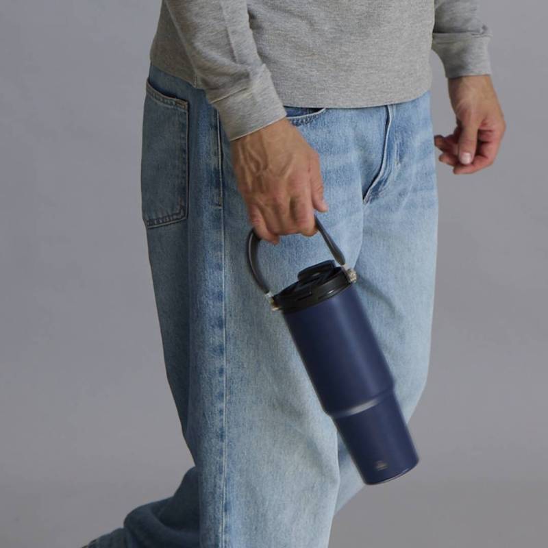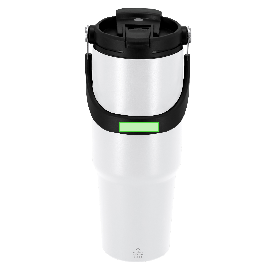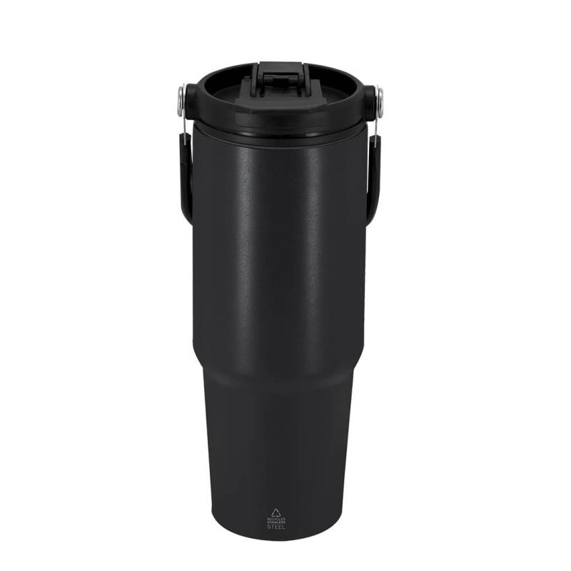 Ver más grande Vaso térmico con 900 ml de capacidad. Fabricado en Acero Inoxidable Reciclado. Cuenta con doble sistema de bebida: orificio con cierre hermético y pajita integrada, adaptándose a las preferencias de uso. Con tapa de sistema de sellado hermético. Incluye práctica asa de transporte, ideal para transportarlo fácilmente en cualquier situación. Libre de BPA. Con distintivo de Acero Inoxidable Reciclado. El acero es uno de los materiales más demandados y que puede encontrarse casi en todas partes, desde productos de uso diario a grandes construcciones. Con innumerables propiedades, entre las que cabe destacar la durabilidad y su alto grado de reutilización, convirtiéndolo en una alternativa muy valorada en soluciones de sostenibilidad. Debidamente tratado, permite obtener nuevos recursos de infinita utilización.