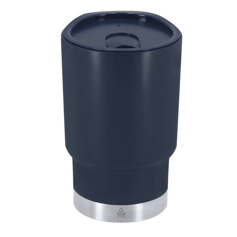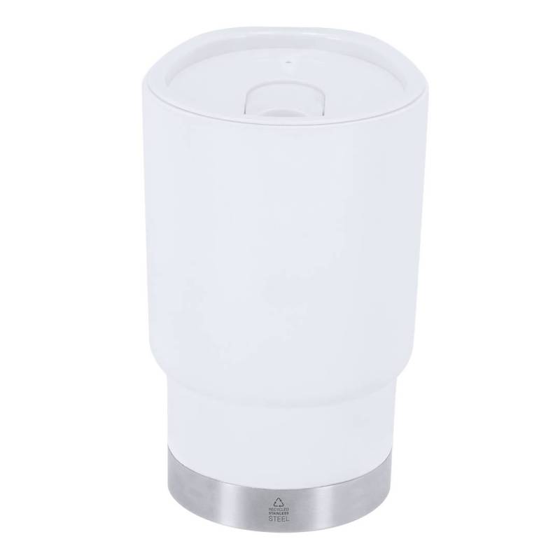 Ver más grande Vaso térmico de 380 ml de capacidad. Fabricado en resistente PP Reciclado de doble pared en combinación con base en Acero Inox Reciclado. Tapa con dosificador de fácil apertura, libre de BPA. Es ideal para tener en tu escritorio, mesa o en cualquier superficie donde disfrutar tranquilamente de tu bebida favorita. Con certificación Food Grade, garantizando la seguridad cuando los alimentos entran en contacto con el material usado para fabricar el producto. Con distintivo de Acero Inox Reciclado. El PP reciclado es un plástico reciclado y altamente reciclable, de gran resistencia y apto para multitud de aplicaciones. El acero es uno de los materiales más demandados y que puede encontrarse casi en todas partes, desde productos de uso diario a grandes construcciones. Con innumerables propiedades, entre las que cabe destacar la durabilidad y su alto grado de reutilización, convirtiéndolo en una alternativa muy valorada en soluciones de sostenibilidad. Debidamente tratado, permite obtener nuevos recursos de infinita utilización.