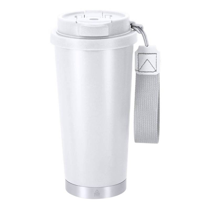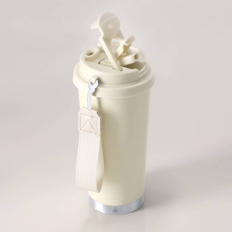 Ver más grande Vaso térmico con 500 ml de capacidad. Fabricado en Acero Inoxidable Reciclado. Cuenta con doble sistema de bebida: orificio con cierre hermético y pajita integrada, adaptándose a las preferencias de uso. Con tapa de sistema de sellado hermético.Incluye práctica cinta de transporte, ideal para llevarlo fácilmente en cualquier situación. Libre de BPA. Con distintivo Acero Inoxidable Reciclado. El acero es uno de los materiales más demandados y que puede encontrarse casi en todas partes, desde productos de uso diario a grandes construcciones. Con innumerables propiedades, entre las que cabe destacar la durabilidad y su alto grado de reutilización, convirtiéndolo en una alternativa muy valorada en soluciones de sostenibilidad. Debidamente tratado, permite obtener nuevos recursos de infinita utilización.