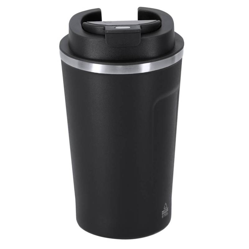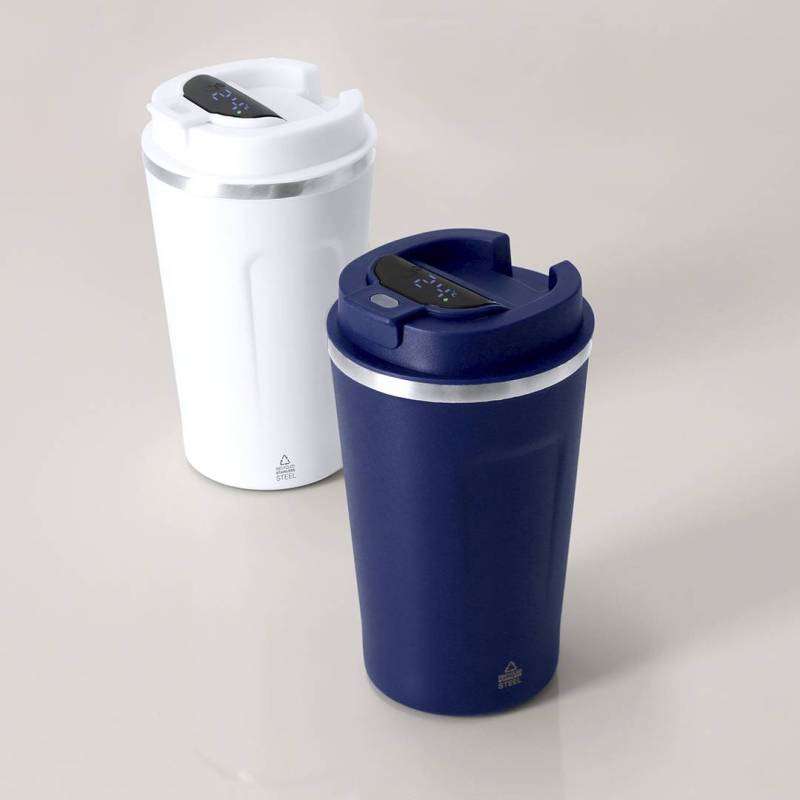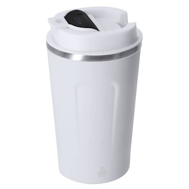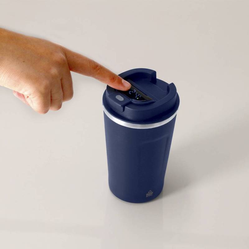 Ver más grande Vaso térmico con capacidad de 400 ml, fabricado en Acero Inoxidable Reciclado. Incorpora pantalla táctil en la tapa que muestra la temperatura interior con solo un toque. Cuenta con tapadera de seguridad para un cierre hermético. Libre de BPA. Incluye distintivo Acero Inox Recliclado. Alimentación a batería. No apto para lavavajillas.