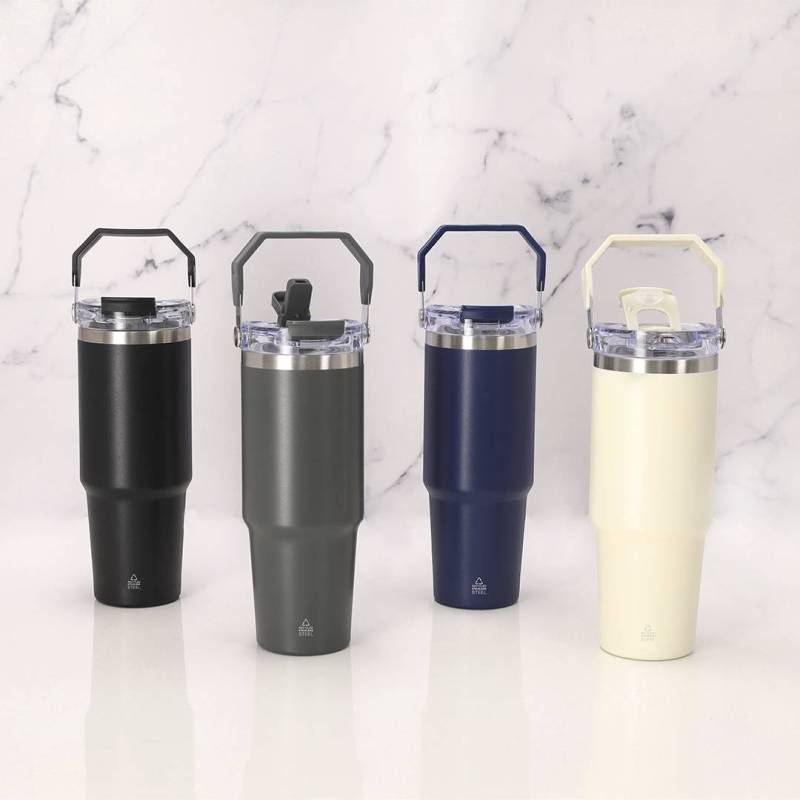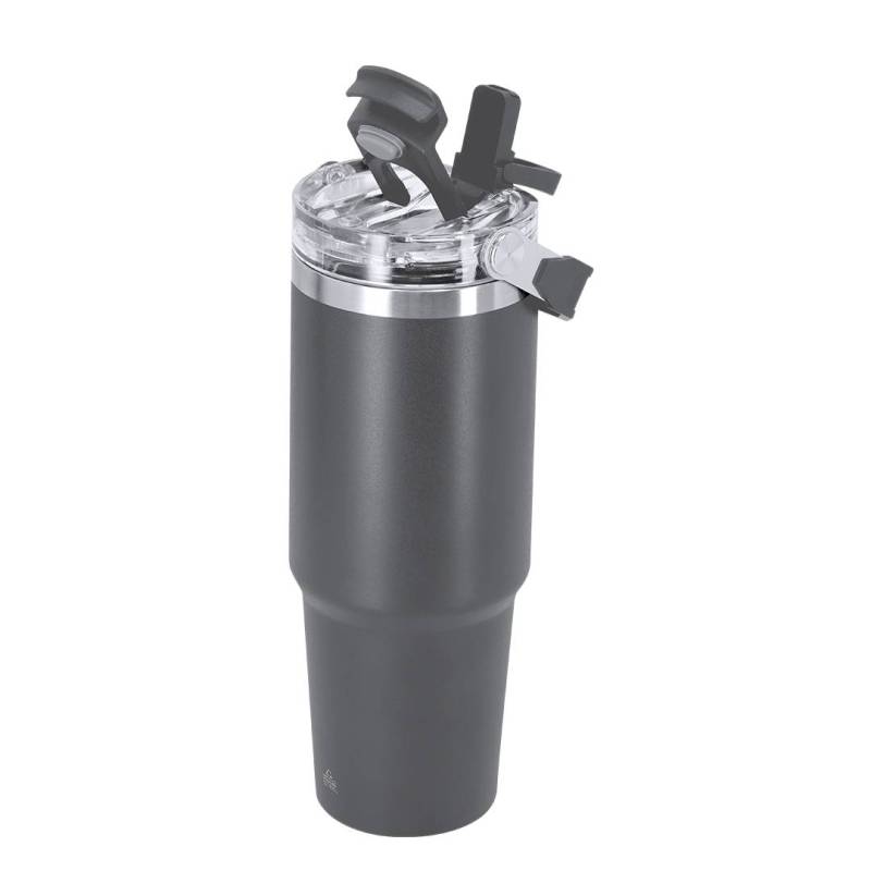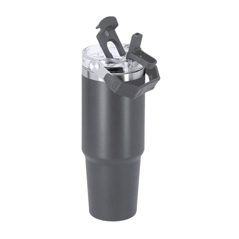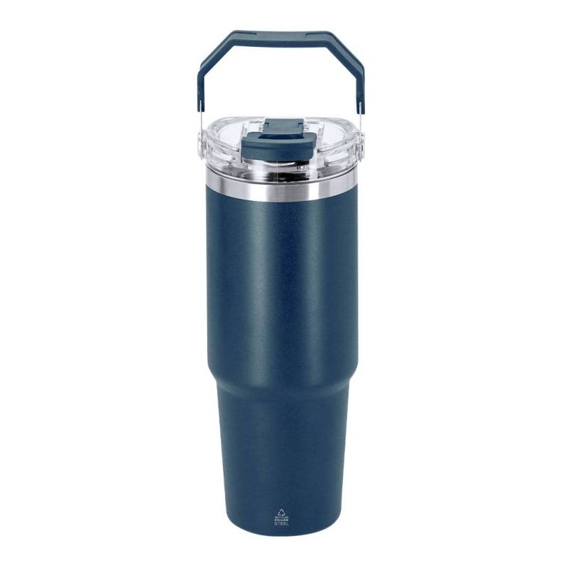 Ver más grande Vaso térmico con 900 ml de capacidad con doble pared. Fabricado en Acero Inoxidable Reciclado. Cuenta con doble sistema de bebida: orificio con cierre hermético y pajita integrada, adaptándose a las preferencias de uso. Con tapa de sistema de sellado hermético. Incluye práctica asa de transporte, ideal para transportarlo fácilmente en cualquier situación. Libre de BPA. Con distintivo de Acero Inoxidable Reciclado.